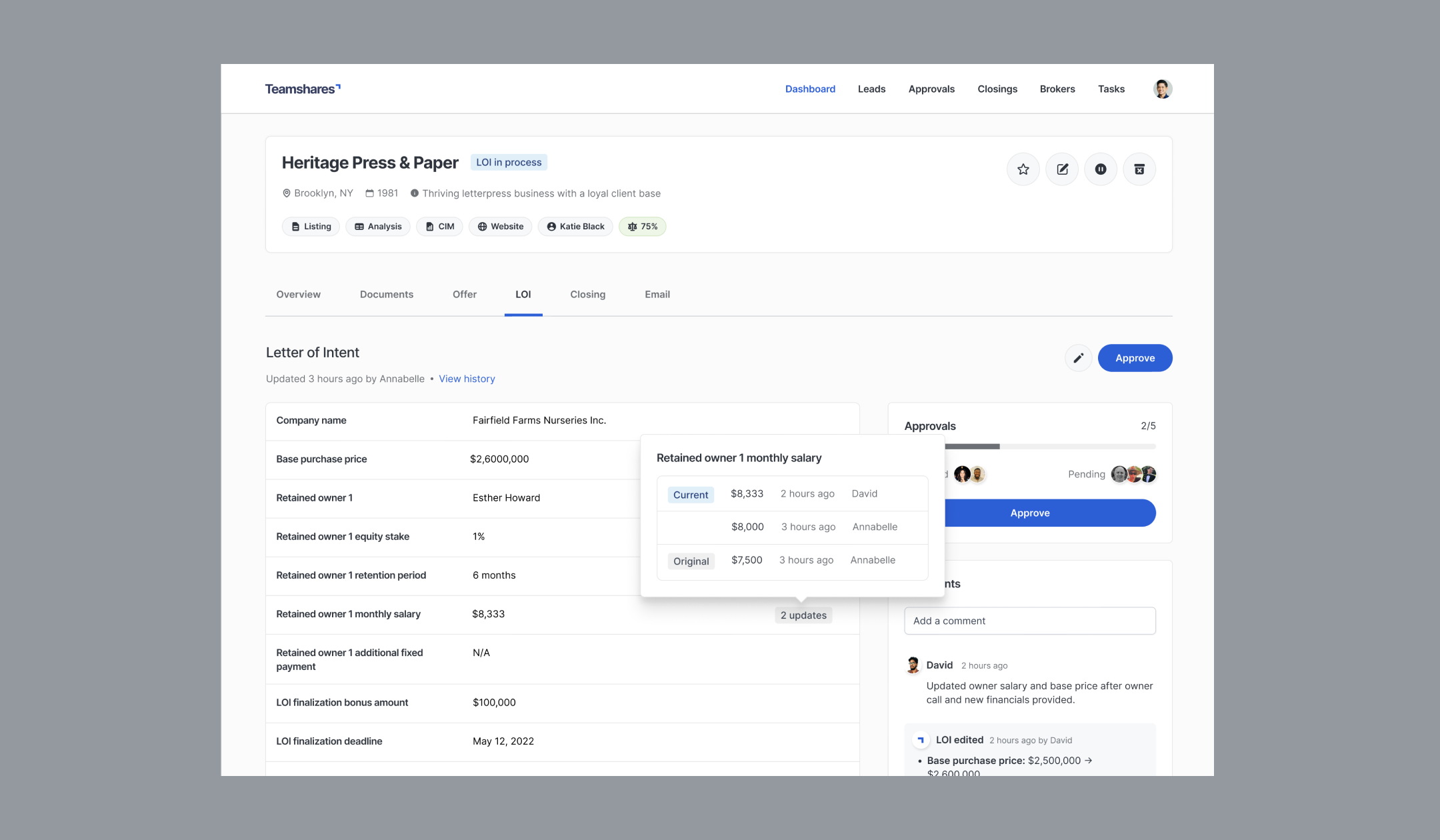 A full change log of deal terms over time, making negotiations trackable and reducing confusion when multiple stakeholders were involved.