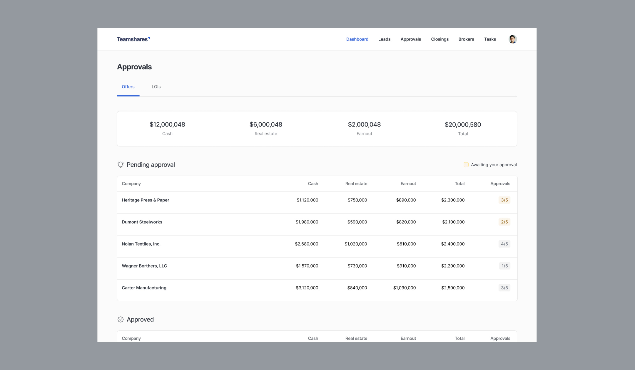 A queue-based view of in-progress offers and LOIs, designed to reduce bottlenecks and make approvals easy to manage and audit.